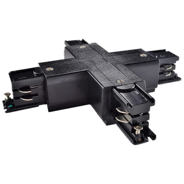 Valkoinen X-liitin kiskojen liittämiseen, verkkoliitäntä mahdollisuus. Liitäntä: ulompi/vasen.