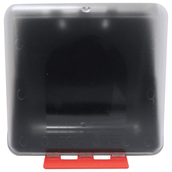 ABS-muovinen säilytyslaatikko, jossa on läpinäkyvä etupuoli ja neljä kuvamerkkiä, jotka voidaan laittaa etupuolelle. Valittavana on käsineet, hengityssuojaimet, kuulosuojaimet ja lasit. Laatikossa on punainen avauskahva, jota voidaan käyttää myös nimikyltteihin tai muihin tietoihin.