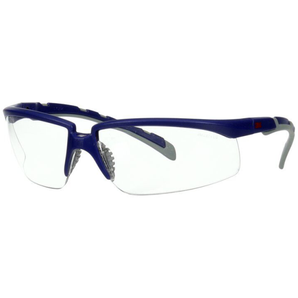 3M Solus 2000 suojalasit sinisellä/harmaalla kehyksellä, kirkkaalla linssillä sekä sumu-naarmuuntumissuojalla. Tämä suojaa linssiä poikkeuksellisen hyvin huurulta ja naarmuilta ankarissa työoloissa. Pantoskooppisten kehysten(korkeussäädettävissä) avulla käyttäjät voivat asettaa lasit yksilölliseen istuvuuteen.