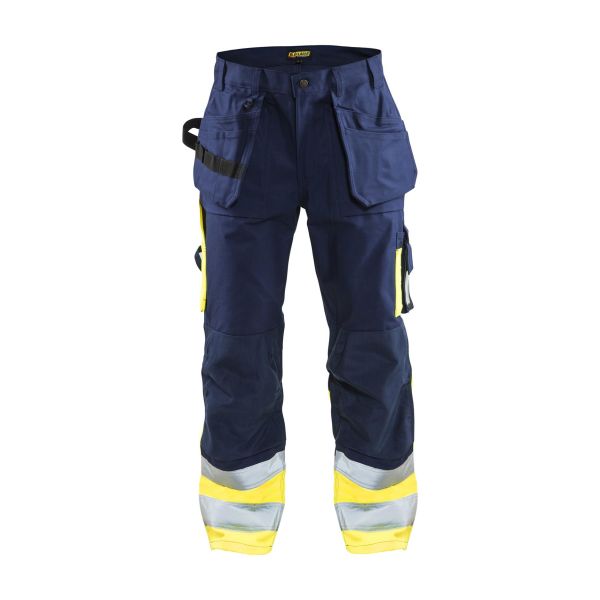 Huomiohousut, joissa on kestävyyttä parantavat CORDURA®-vahvikkeet polvissa, vasaralenkki sivulla, leveät lenkit, vyölenkit, joista yhdessä D-rengas, henkilökorttitasku, laskokselliset takataskut, reisitasku kynätaskulla, lisätasku ja puhelintasku. Laskokselliset etutaskut, kaikkien Blåkläder-polvisuojien kanssa yhteensopivat polvisuojataskut, naulataskut meisselitaskuilla ja työkalulenkit, voidaan työntää laskoksellisiin etutaskuihin. Taittomittatasku, jossa puukkopidike ja kynätasku. Standardin EN ISO 20471/EN 20471 mukainen, luokka 1, erittäin näkyvä suojavaatetus, sekä standardin EN 14404 mukainen yhdessä standardin EN 14404 mukaisten polvisuojien kanssa, tuote: 4018, 4000, 4008. Materiaali: 65 % polyesteria, 35 % puuvillaa, twill, 300 g/m².