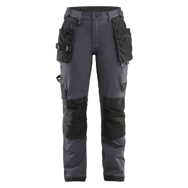 Naisten riipputaskuhousut hieman ohuemmasta neljään suuntaaan joustavasta kankaasta, jotka tarjoavat erinomaisen käyttömukavuuden. Housuissa on kapeampi istuvuus ja korkeampi säädettävä vyötärö, joka lisää mukavuutta. Irrotettavat riipputaskut, palkeelliset takataskut, mittatasku ja lenkki vasaran pidikkeelle sekä vasemmalla että oikealla puolella. Polvisuojataskut kestävästä CORDURA®-stretch-materiaalista.