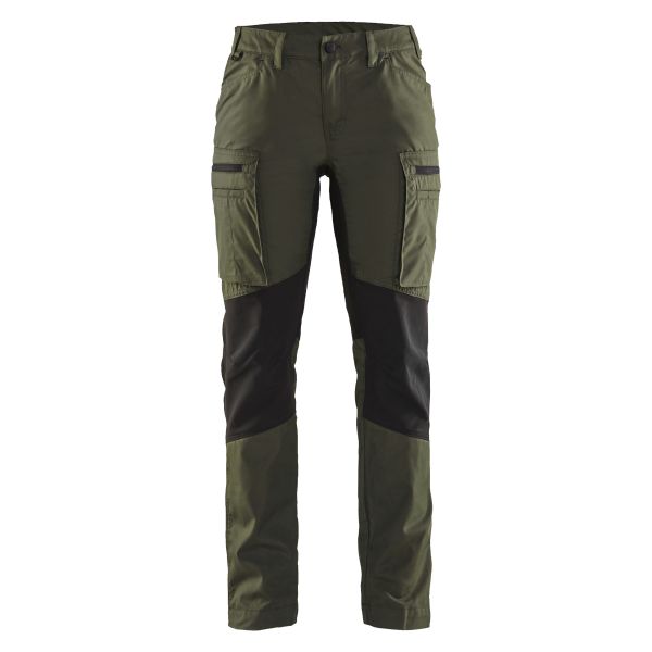 Modernit naisten työhousut kevyestä, mutta kestävästä ja nopeasti kuivuvasta kankaasta. Ne sopivat täydellisesti sisä- tai ulkokäyttöön lämpimällä säällä. Työhousut ovat kapeammat istuvuudeltaan, joustavat vyötäröstä ja esitaivutetut lahkeiden/polvitaipeiden kohdalta lisäämään käyttömukavuutta. Housuissa on joustavat stretch-osiot valituissa kohdissa optimaalisen liikkuvuuden mahdollistamiseksi.