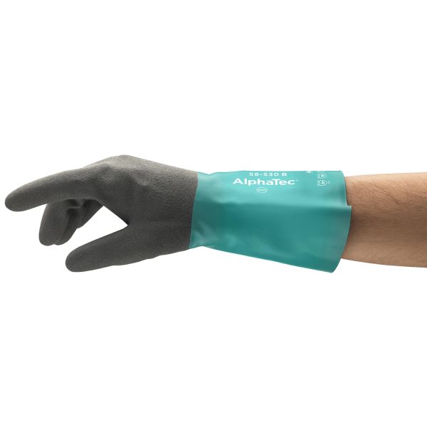 Ansell AlphaTec 58-535 W on nitriilikumista valmistettu koon 10 käsine. Ansell Grip Technology™ -teknologian avulla käyttäjät saavat paremman otteen ja hallinnan käsitellessään märkiä tai öljyisiä esineitä. Käsineen pituus on 356 mm, ja ehjä nitriilikuori suojaa hyvin emäksiltä, öljyiltä, polttoaineilta, tietyiltä liuottimilta ja rasvoilta. AlphaTec 58-530 W -käsineen luotettava kemikaalisuojaus parantaa käyttäjien turvallisuutta. Ansellin patentoitu Grip Technology™ estää polymeeripinnoitetta tunkeutumasta vuorin läpi valmistuksen aikana. Pinnoite on siten ehjä ja turvallinen sekä vähentää merkittävästi iholle pääsevän kemiallisen vuodon todennäköisyyttä. Suositellaan metallin työstöön ja kokoonpanoon, nesteiden ja kiinteiden aineiden siirtoon tai sulatusuunien, tyhjennyspumppujen, venttiilien, putkistojen tai krakkauslaitteiden avaamiseen.