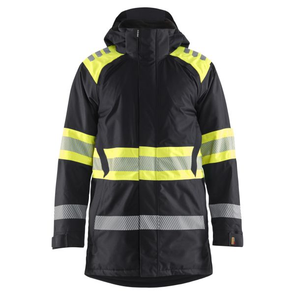 Highvis -talviparkatakki (luokka 1) tikatulla vuorella, joka pitää sinut lämpimänä. Takki on tuulen- ja vedenpitävä teipatuilla saumoilla. Irrotettava huppu soveltuu käytettäväksi kypärän ja kuulosuojaimien kanssa. Säädettävä vyötärö ja vetoketjut sivuilla, joista pääset käsiksi sisätaskuihin avaamatta etuosaa. Takissa on vahvikkeet edessä ja hihoissa. Tilava ja miellyttävä istuvuus. Selän joustopaneeli lisää käyttömukavuutta. Sivuilla olevat vetoketjut helpottavat liikkumista eivätkä rajoita liikkeitä työskenneltäessä polvillaan tai kyykyssä.